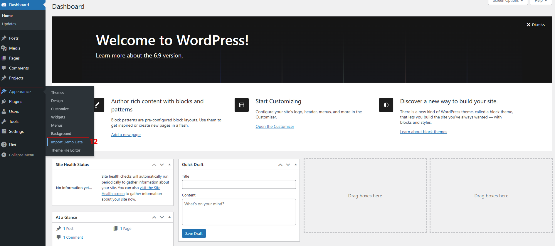 Go to Appearance > Import Demo Data from the WordPress Dashboard.