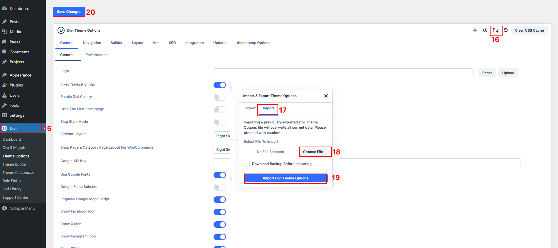 – Click Import, select the divi_theme_options.json file, and click Import Divi Theme Options.